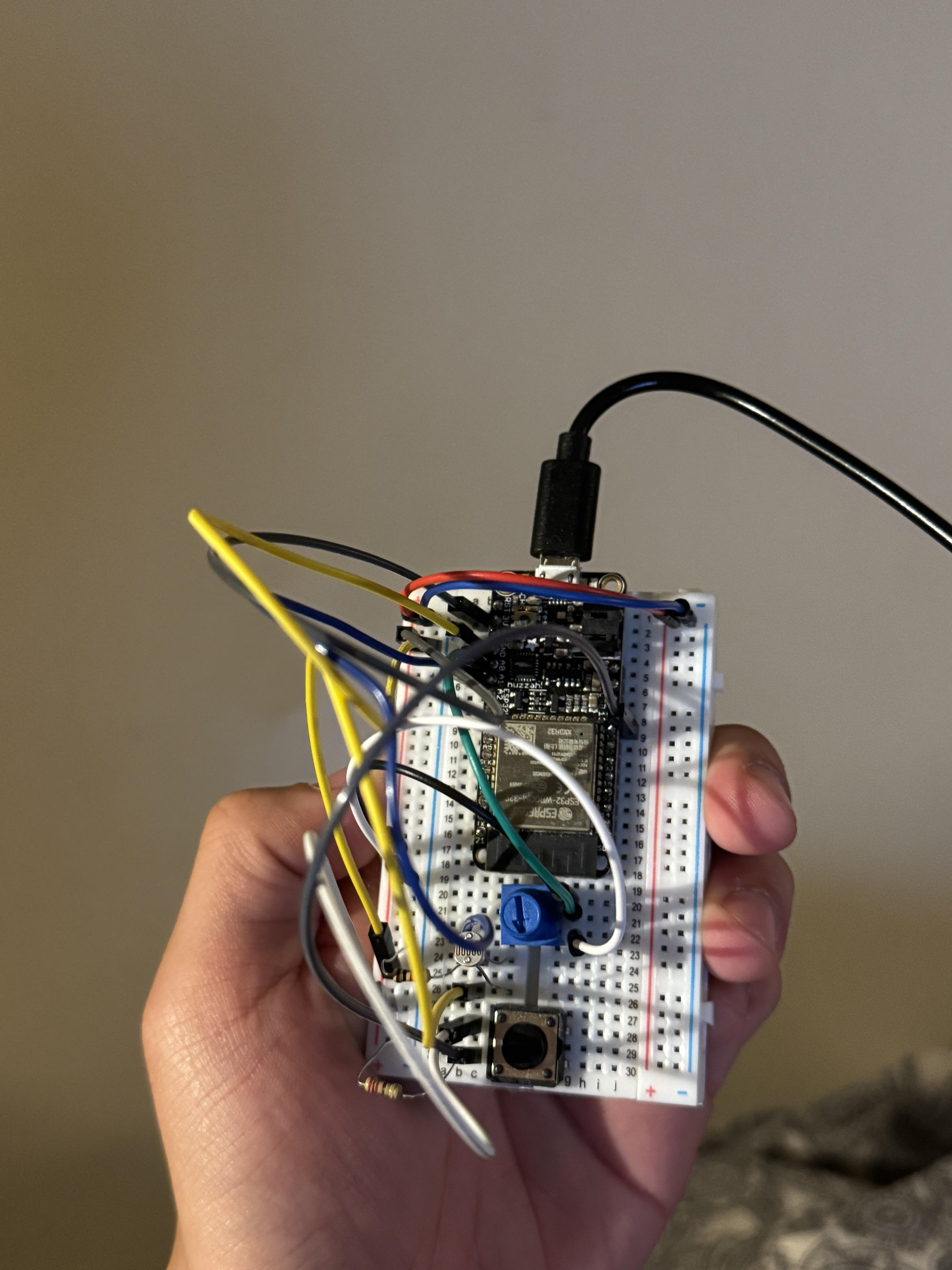 The potentiometer, photoresistor, and button are placed on a breadboard for easy access and usability during performance.